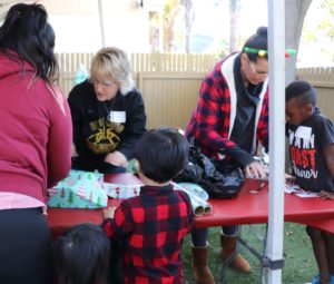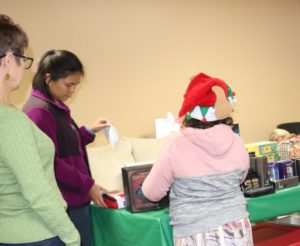 The children are invited to come with their parents and are greeted by volunteers ready to escort them to a room full of wonderful items for the children to choose a gift for their parents. The volunteers usher them to the Elves Station to have the gift wrapped with beautiful ribbons and bows. After all that hard work the children are entertained with games and crafts and fill their tummies with cookies, doughnuts, pizza, and other refreshments.